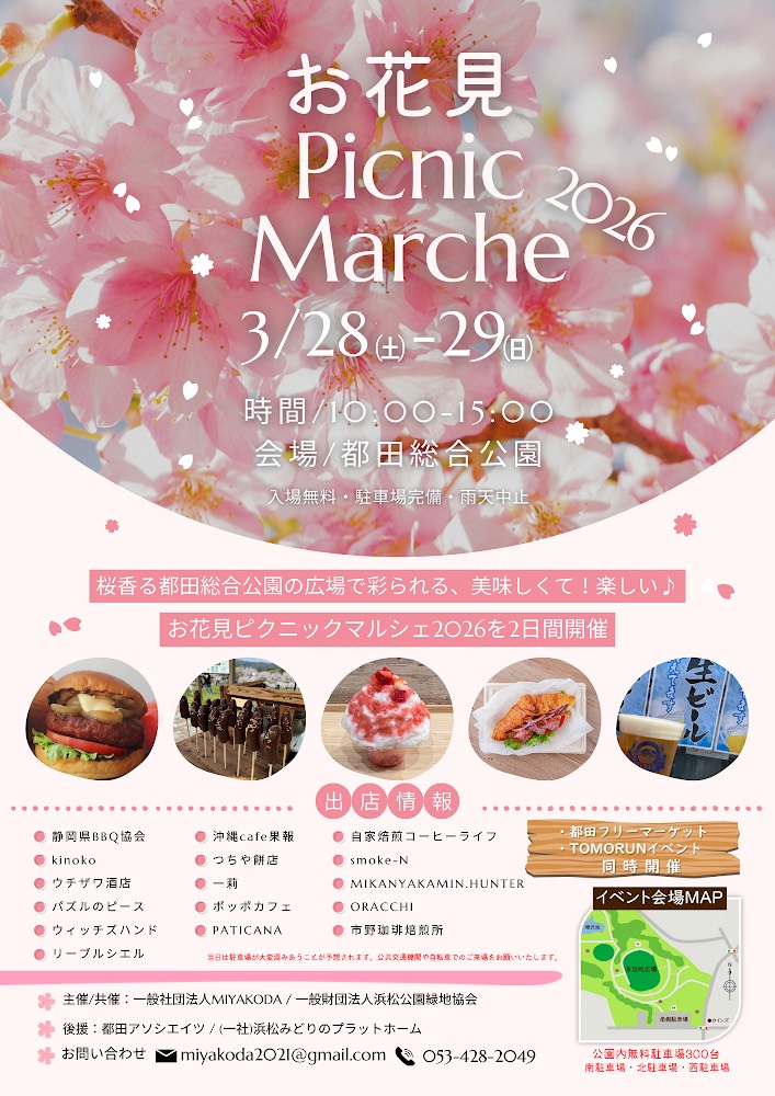 桜香る都田総合公園の芝生広場で彩られるおいしくて!たのしくて!おもしろい!お花見ピクニックマルシェを2日間開催致します。グルメ・癒し・体験などお花見企画満載のSAKURA.2daysイベント!ご家族、ご友人同士、カップルでぜひ遊びにお越しください♪●日程:2025年3月29日(土)&30日(日)●時間:10時00分~15時00分●会場:都田総合公園 芝生広場 / 南駐車場側●入場無料 / 雨天中止 / 駐車場完備 - 2024/11/17
